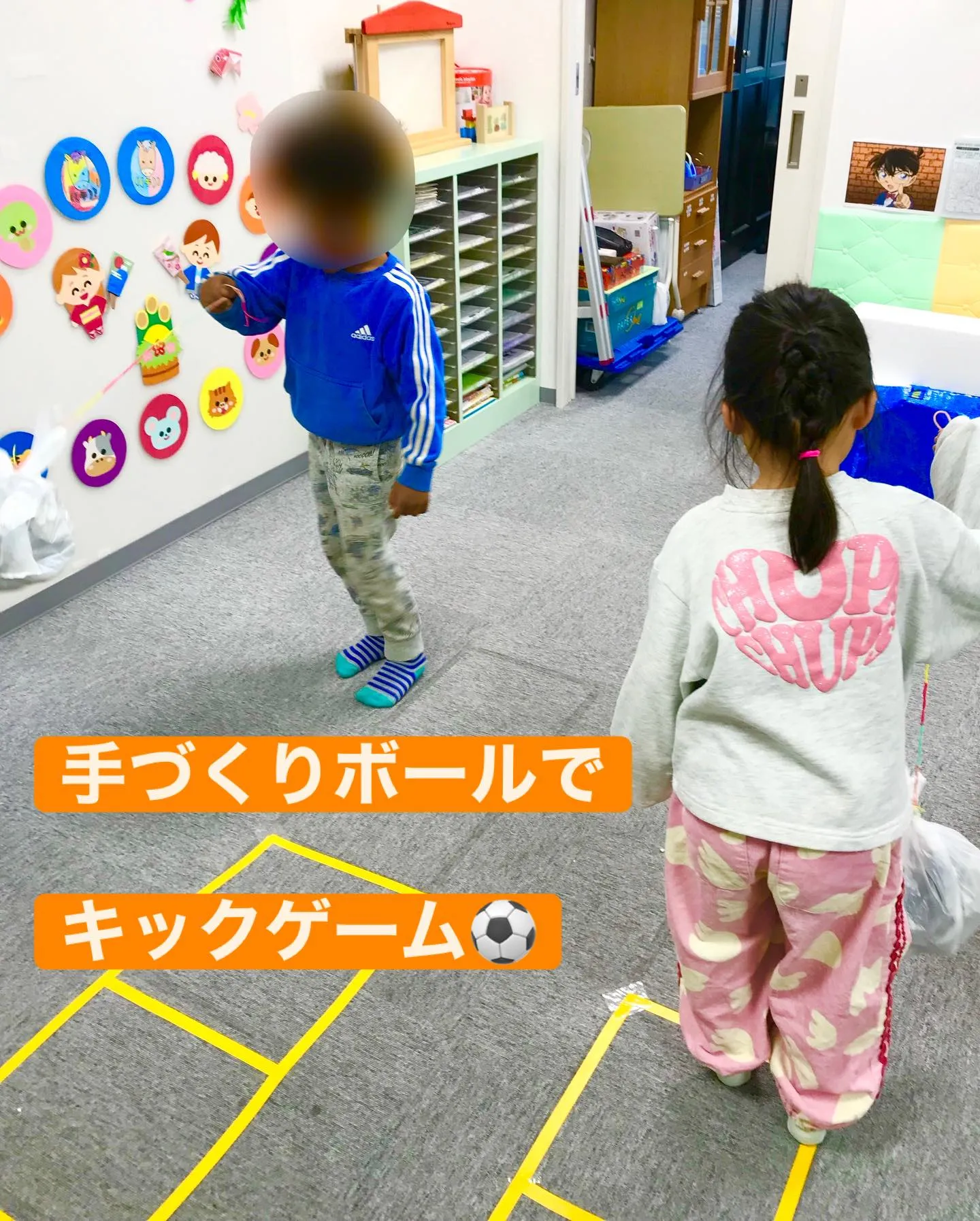 新聞紙を詰めた手づくりボールを 新聞紙を詰めた手づくりボールを長くつなげたゴムと合体🤩ポーンと蹴ると自分のところに戻ってきます🤗・蹴って戻ってくることで、力加減の調整を学びます♩・ボールの動きを目で追い、戻ってくる所を予測す…