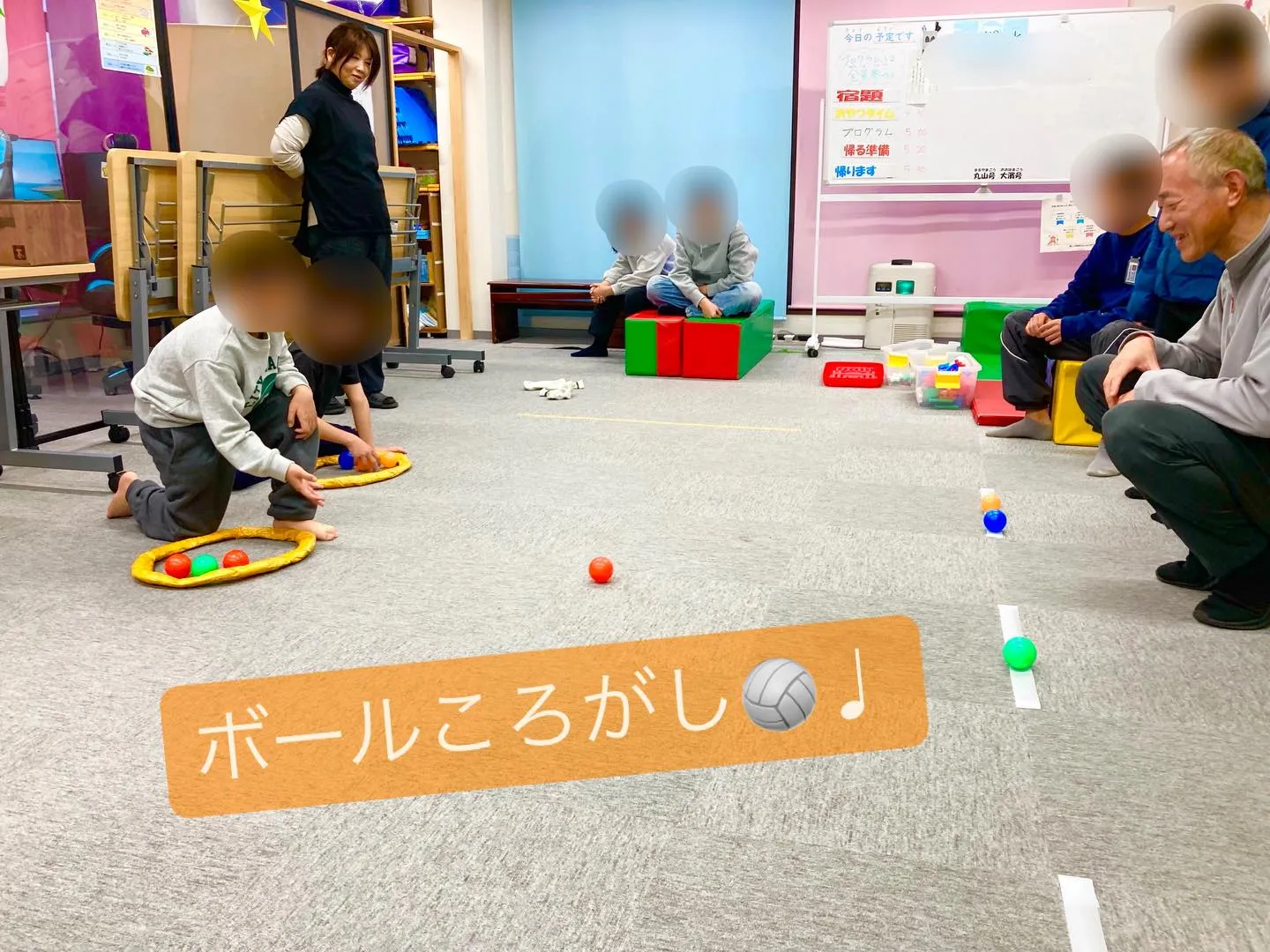 ボールころがし🏐♩ ボールころがし🏐♩目印のテープをめがけてボールを転がします❣️誰がいちばんテープに近づけるかな?ボールころがしゲームでは、、、・目で目標を捉え、力加減を考え、「どこに・どのくらいの力で」転がすかを…